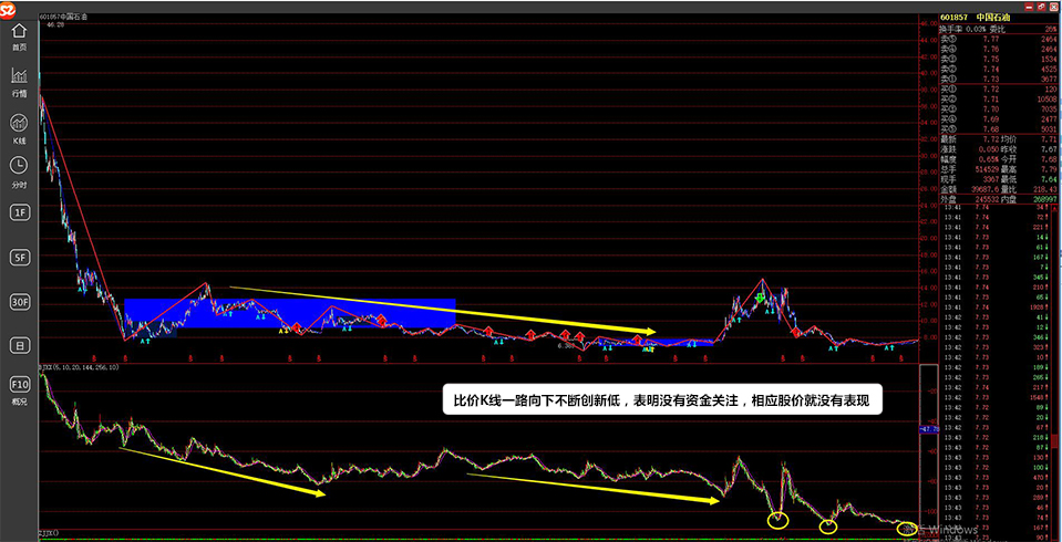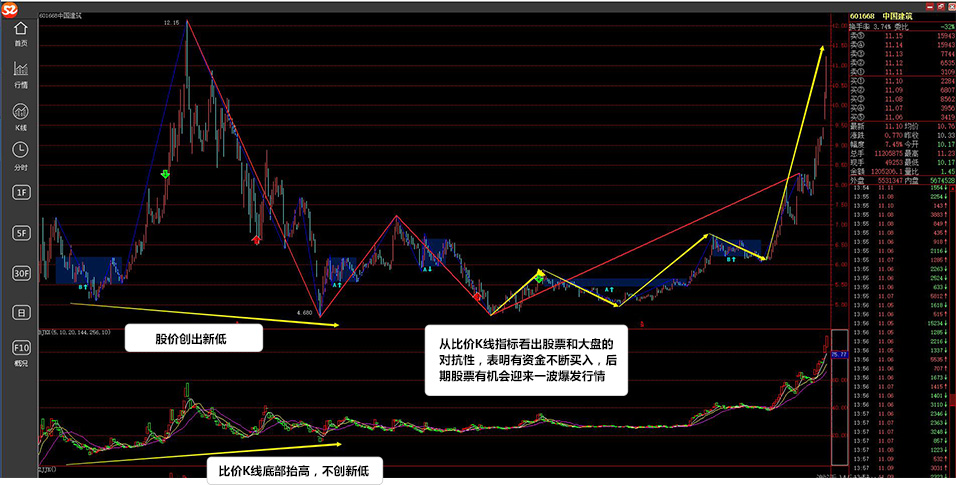 当股价创新低时,比价K线不创新低;当股价横盘,但比价K线一路向上,这两种情况的出现,也预示着这支个股有望成为潜力牛股。